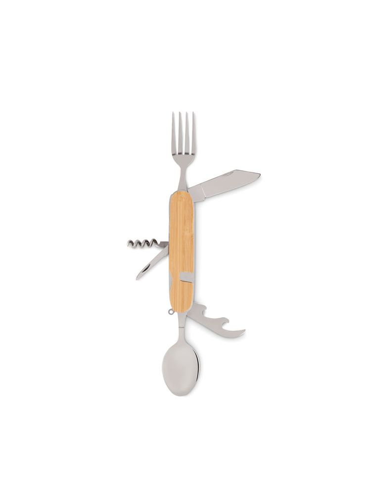 Metalowy wielofunkcyjny składany zestaw sztućców kempingowych w drewnianej obudowie. 5 funkcji. Zawiera widelec, łyżkę, otwieracz do puszek, otwieracz do wina i nóż. Można podzielić zestaw na 2.