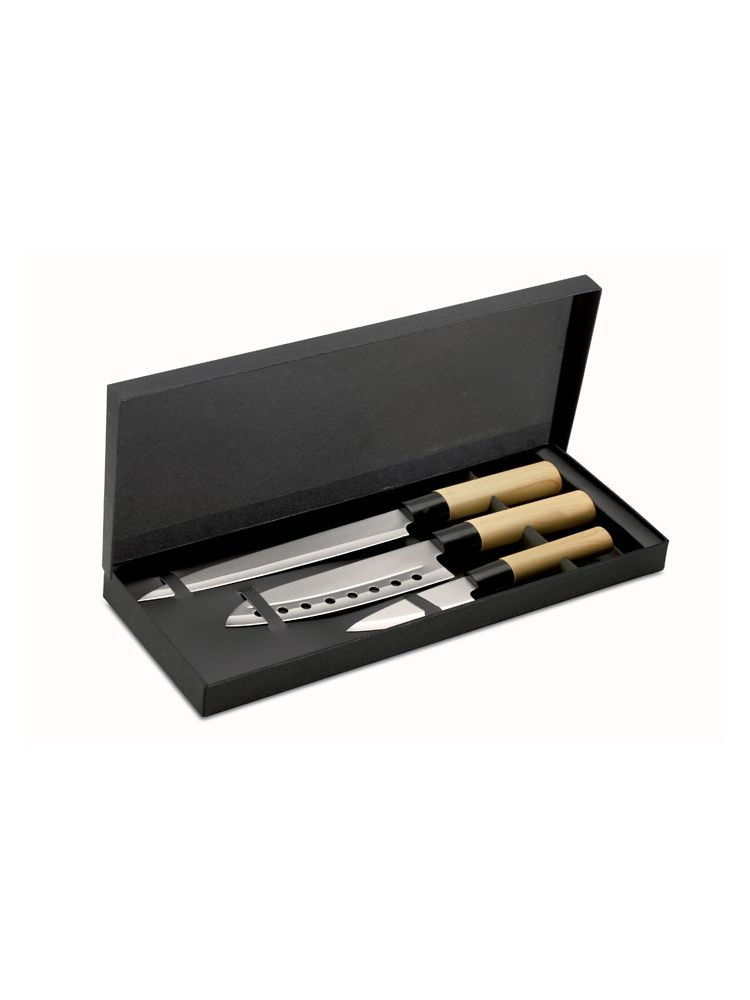 Zestaw 3 noży w japońskim stylu, zapakowanych w kartonowe ozdobne pudełko. Ostrza ze stali nierdzewnej. Plastikowe trzonki.