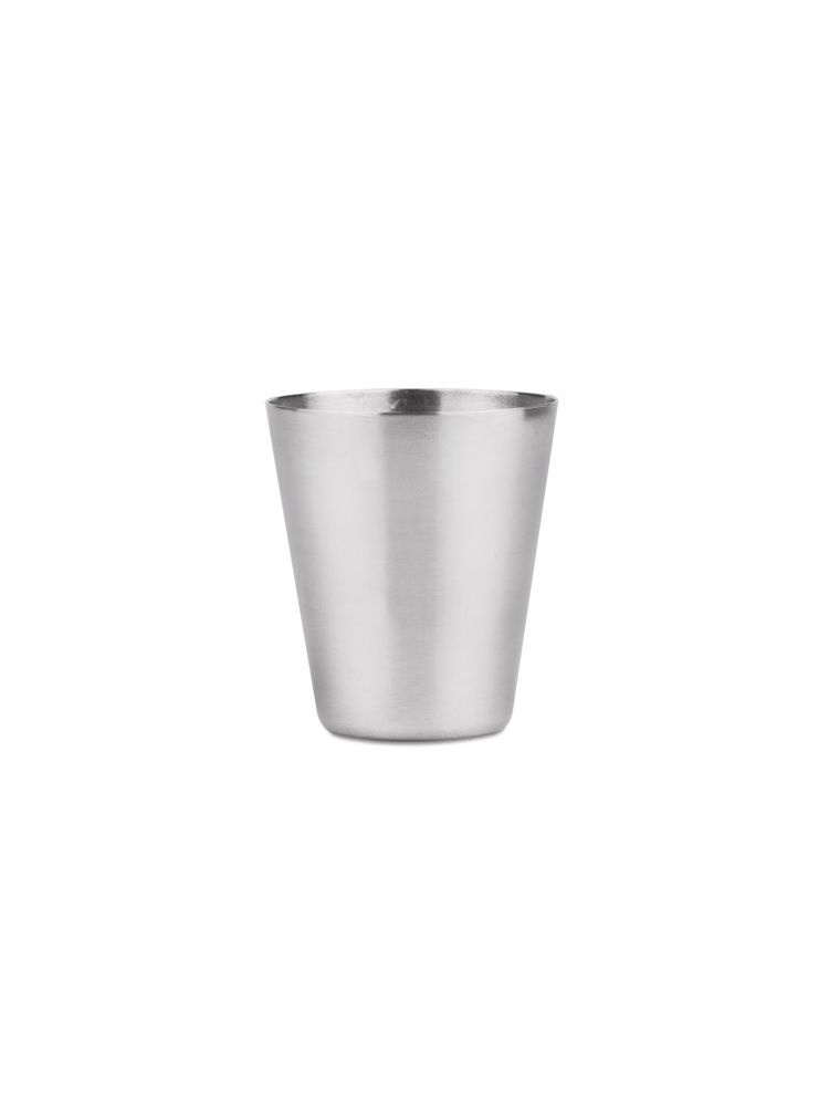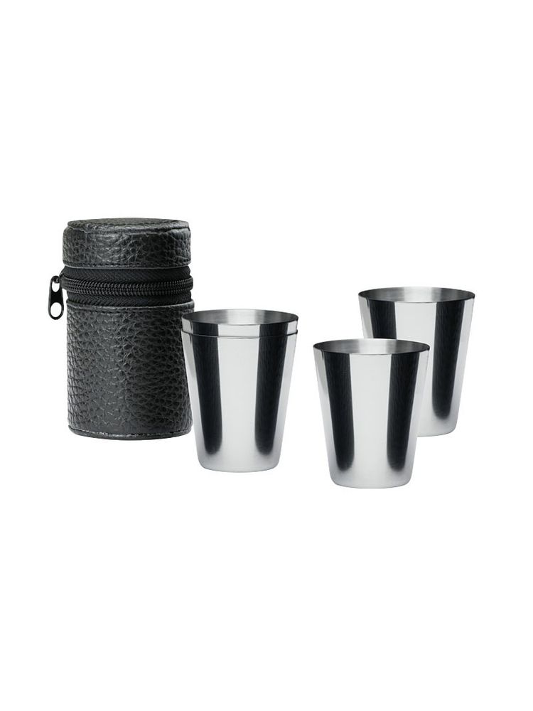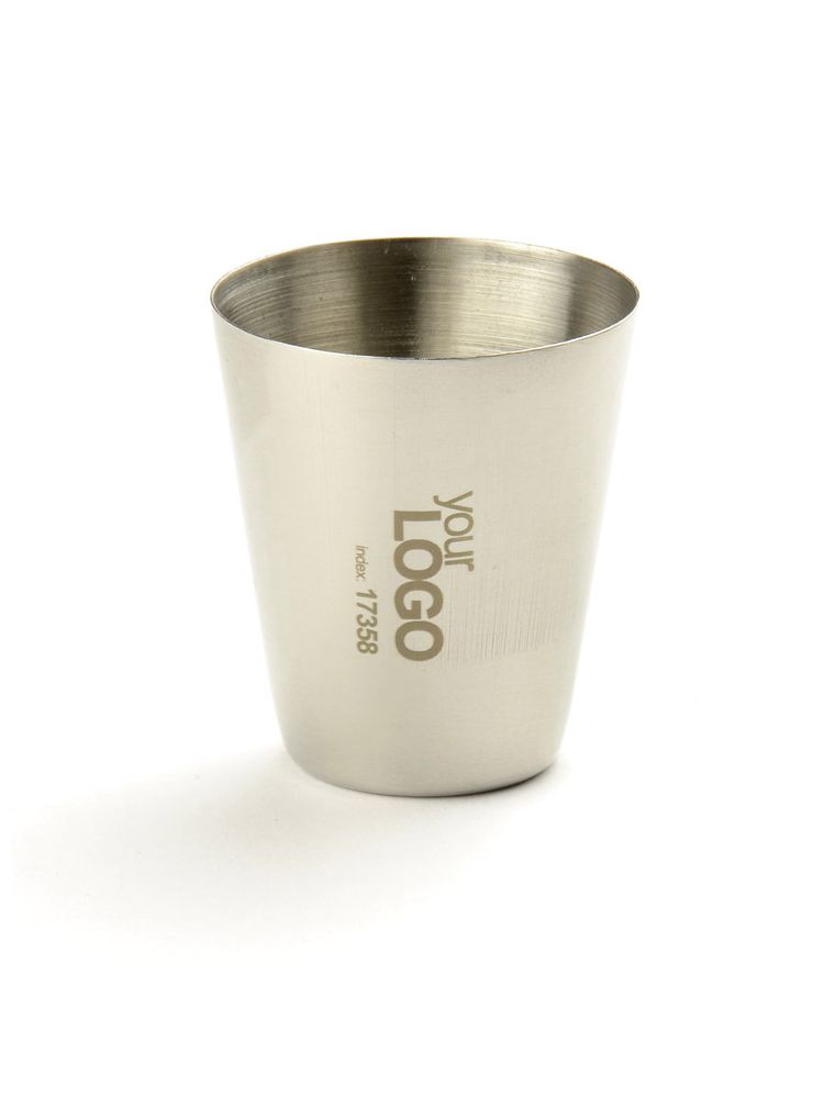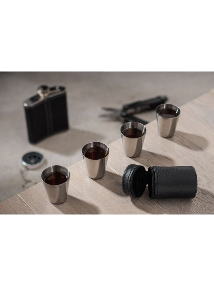 Cztery kieliszki stalowe o pojemności 30 ml pakowane w etui z ekoskóry PU zapinanego na zamek. Logo grawerujemy na powierzchni kieliszków.