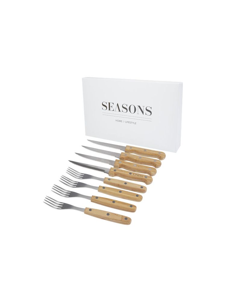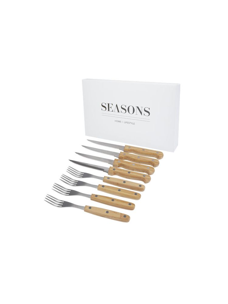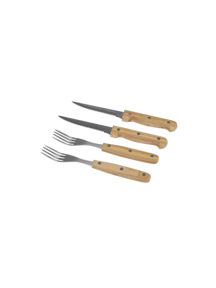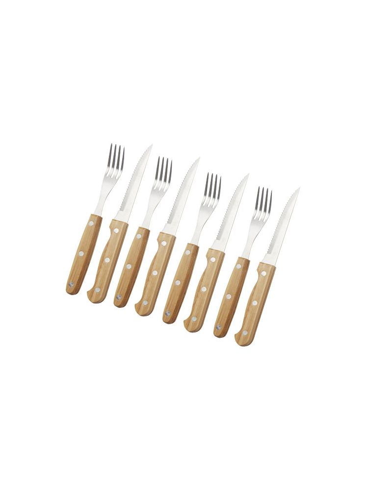 Zestaw 8 sztućców do steków z 4 nożami do steków (21,2 × 2 cm) i 4 widelcami do steków (19,8 × 2,1 cm). Niezbędny podczas weekendowych kolacji dla smakoszy, aby pokroić stek w dobrym stylu. Uchwyty wykonane są z bambusa, który jest pozyskiwany i produkowany zgodnie z zasadami zrównoważonego rozwoju.