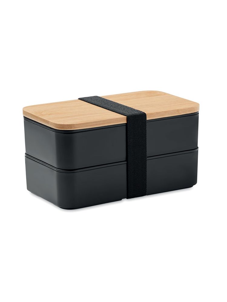Dwupoziomowy pojemnik na lunch z PP z bambusową pokrywą, zawierający 1 wyjmowaną przegródkę z PP i 3 sztućce, z dołączaną opaską poliestrową. Pojemność 400 ml (2x). Bambus jest produktem naturalnym, dlatego mogą wystąpić nieznaczne różnice w kolorze, wzorze i rozmiarze.