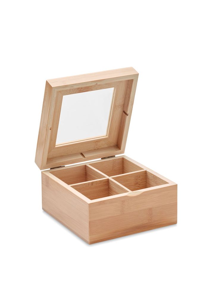 Bambusowe pudełko na herbatę ze szklaną pokrywką. W 4 przegródkach można umieścić 24 torebki herbaty. Bambus jest produktem naturalnym, mogą występować niewielkie różnice w kolorze i rozmiarze. Wymiary pojedynczej przegródki: 6×6×6cm.