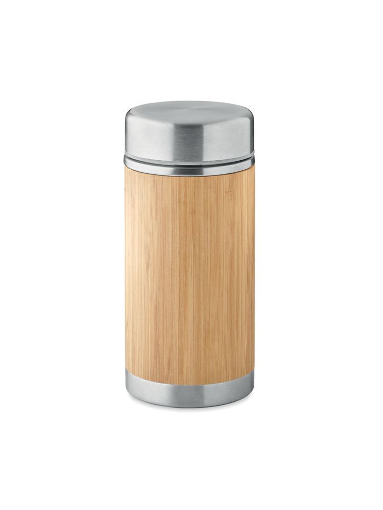 Izolowany pojemnik na żywność z podwójną ścianką ze stali nierdzewnej z zakrętką. Wykończenie bambusowe. Pojemność: 600 ml. Bambus jest produktem naturalnym, dlatego mogą wystąpić nieznaczne różnice w kolorze, wzorze i rozmiarze.