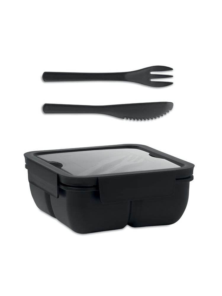 Lunchbox z PP z 2 przegródkami. Zawiera zestaw sztućców PP w pokrywie. Pojemność: 600 ml.