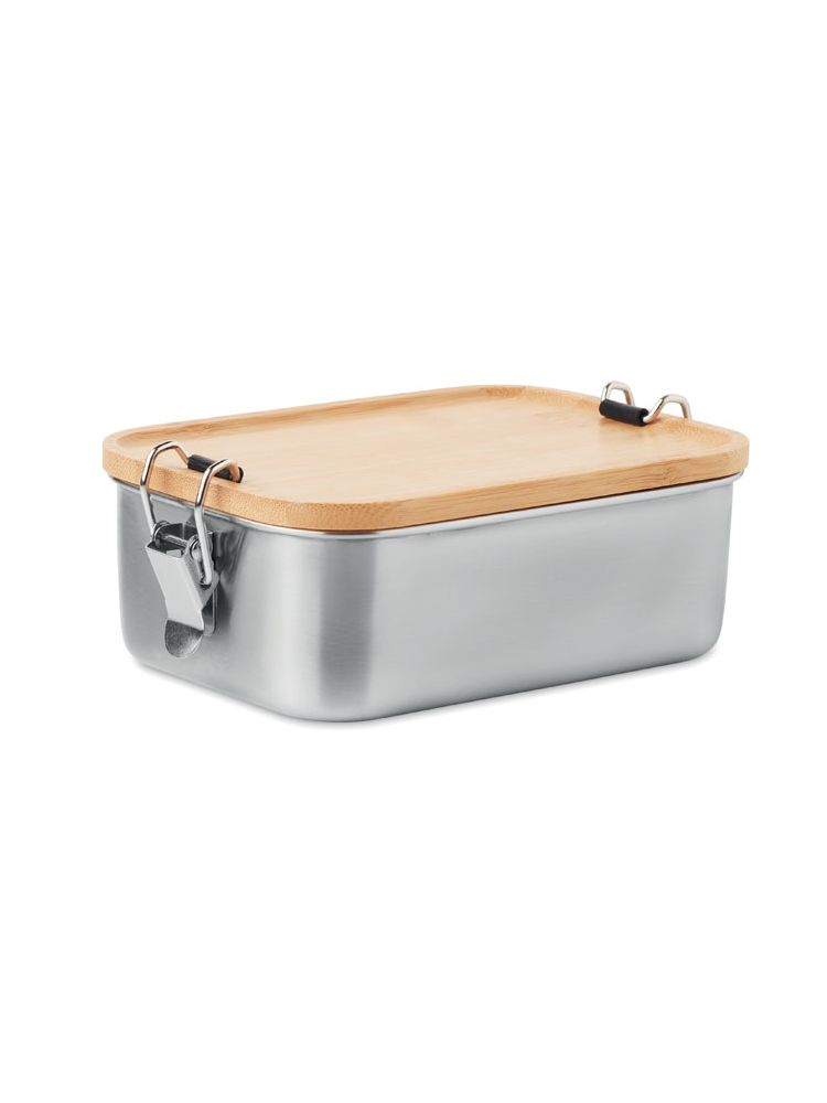 Lunchbox ze stali nierdzewnej z bocznymi klamrami zamykającymi i bambusową pokrywką. Pojemność: 750 ml. Bambus jest produktem naturalnym, dlatego mogą wystąpić nieznaczne różnice w kolorze, wzorze i rozmiarze.