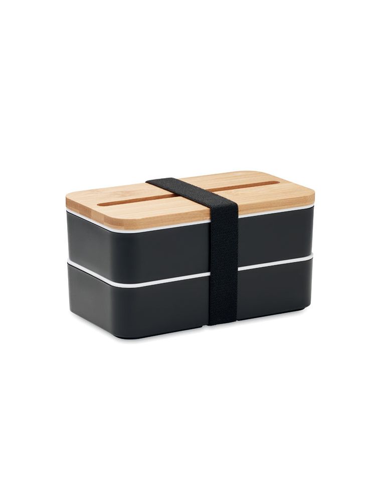 Dwupoziomowy pojemnik na lunch z PP z z wyjmowaną przegrodą i 3 sztućcami, z dołączoną opaską poliestrową, z bambusową pokrywą. Pokrywa ma funkcję podstawki pod telefon. Pojemność: 400 ml (2x). Bambus jest produktem naturalnym, dlatego mogą wystąpić nieznaczne różnice w kolorze, wzorze i rozmiarze.