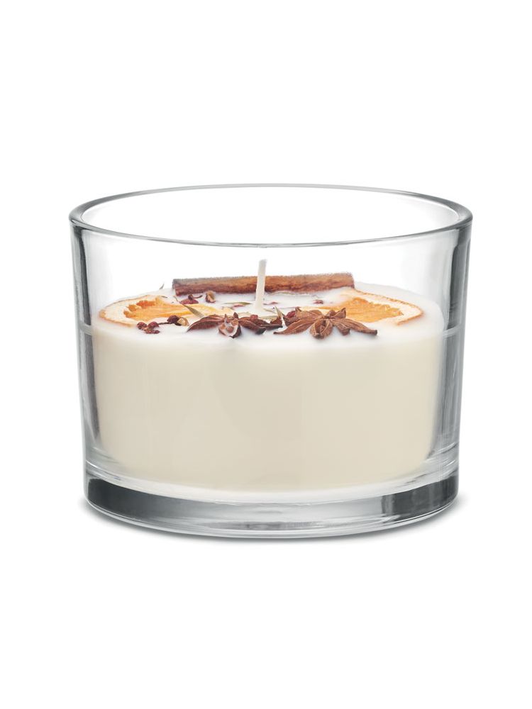 Zapachowa świeca woskowa na bazie roślin z suszonymi kwiatami i owocami w szklanym pojemniku. 300 gr. Czas palenia: 50 godzin.