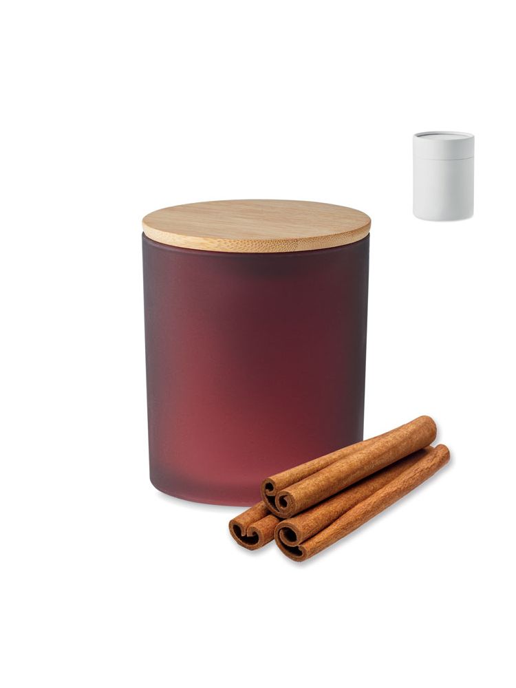 Wosk roślinny, świeca roślinna o zapachu cynamonu, wanilii, drzewa sandałowego lub jaśminu w szklanym, matowym słoiku z bambusową pokrywką. 280 gr. Czas palenia: 46 godzin. Zapakowane w papierowe pudełko prezentowe w kształcie tuby. Bambus jest produktem naturalnym, dlatego mogą wystąpić nieznaczne różnice w kolorze, wzorze i rozmiarze.