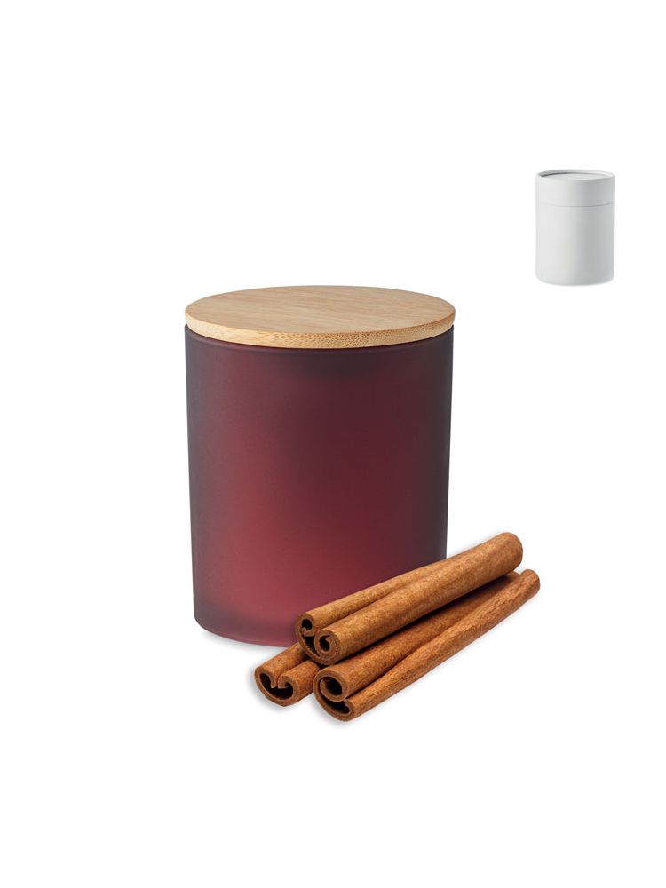 Wosk roślinny, świeca roślinna o zapachu cynamonu, wanilii, drzewa sandałowego lub jaśminu w szklanym, matowym pojemniku z bambusową pokrywką. 120 gr. Czas palenia: 20 godzin. Prezentowana w papierowym pudełku upominkowym w kształcie tuby. Bambus jest produktem naturalnym, dlatego mogą wystąpić nieznaczne różnice w kolorze, wzorze i rozmiarze.