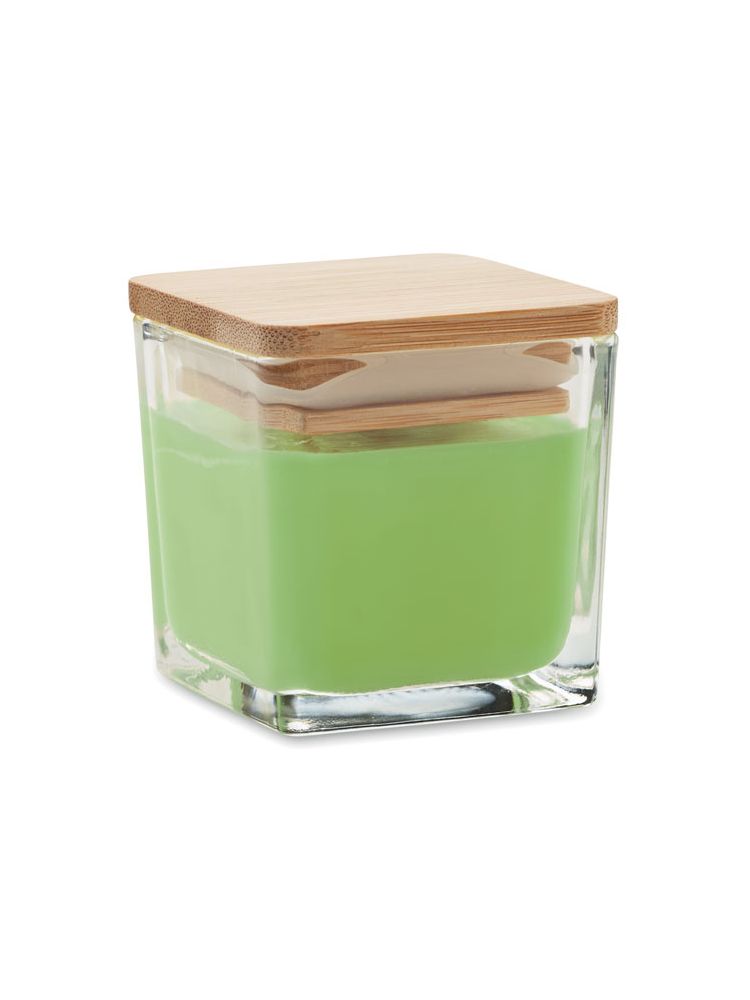 Zapachowa świeca woskowa na bazie roślin w kwadratowym szklanym pojemniku z bambusową pokrywką. 50 gr. Czas palenia: 8 godzin. Biały (06) zapach waniliowy, żółty (08) zapach cytrynowy, pomarańczowy (10) zapach pomarańczowy, zielony (48) zapach jabłkowy.