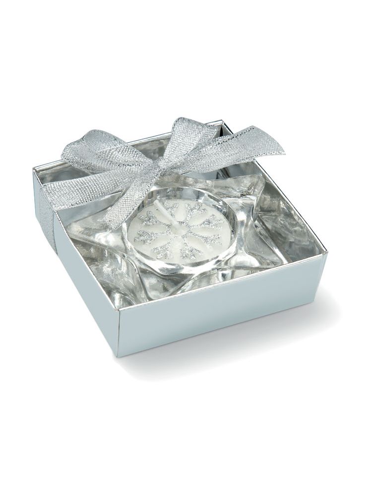 Szklany świecznik w kształcie gwiazdki, zapakowany w srebrny kartonik z przeźroczystym wieczkiem i wstążeczką.