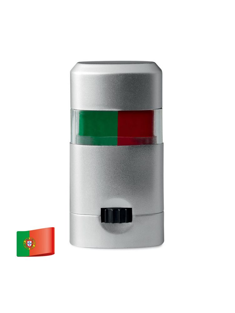 Trójkolorowe flamastry do malowania po twarzy. Pakowane w srebrne plastikowe pudełko z przezroczystym wieczkiem. Barwy flag Hiszpanii, Niemiec, Włoch, Holandii.