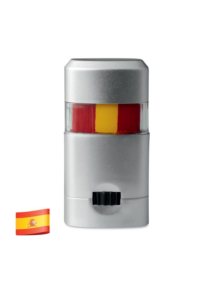 Trójkolorowe flamastry do malowania po twarzy. Pakowane w srebrne plastikowe pudełko z przezroczystym wieczkiem. Barwy flag Hiszpanii, Niemiec, Włoch, Holandii.