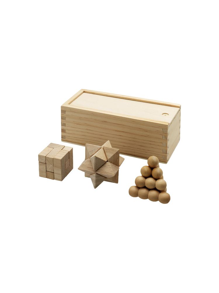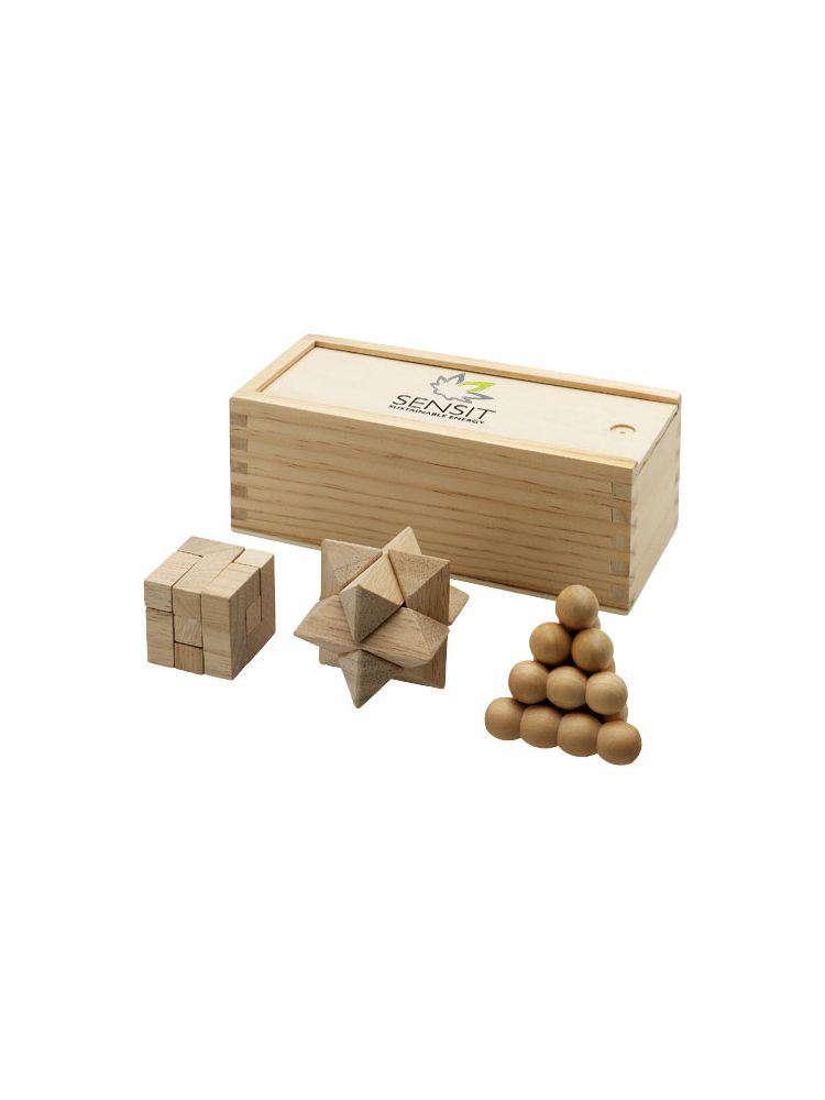 Zestaw 3 łamigłówek w drewnianym pudełku. Nadruk niemożliwy na poszczególnych elementach łamigłówek. Ostrzeżenie! Nieodpowiednie dla dzieci poniżej trzeciego roku życia. Małe części. Ryzyko zadławienia.