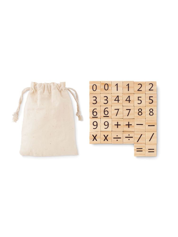 Drewniana gra edukacyjna do liczenia w bawełnianym woreczku. Zawiera 32 elementy.