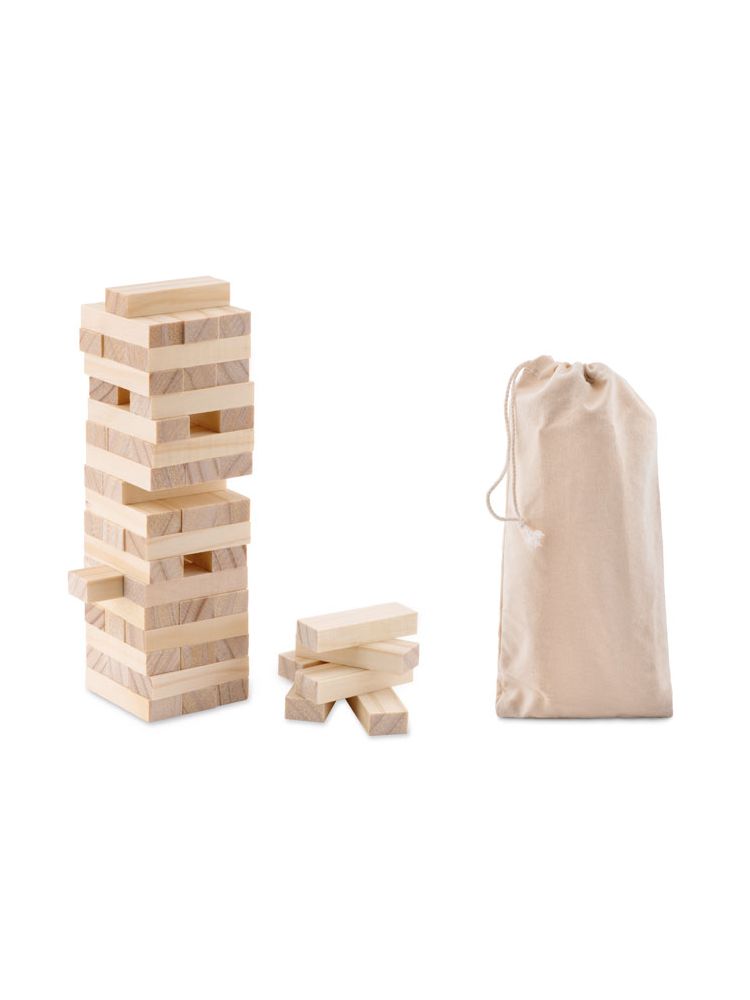 Drewniana gra ‘‘wieża’‘(54 klocki). Zapakowana w bawełnianą torbę.