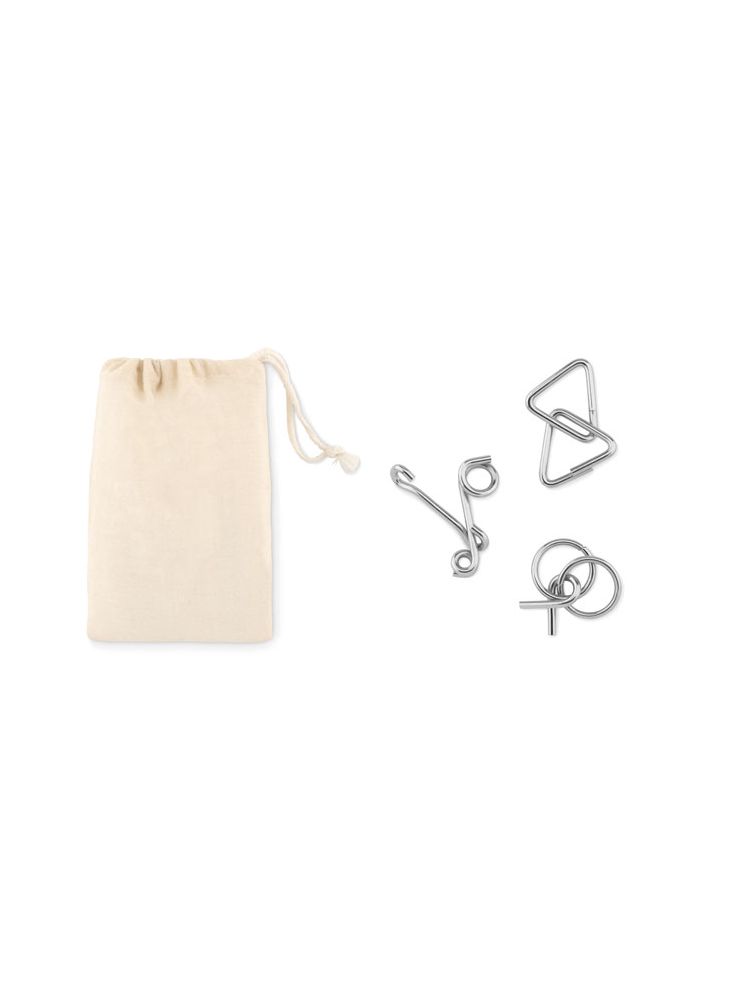 Zestaw 3 łamigłówek z metalu zapakowanych w bawełniany woreczek.