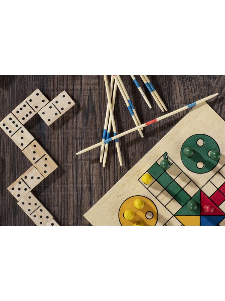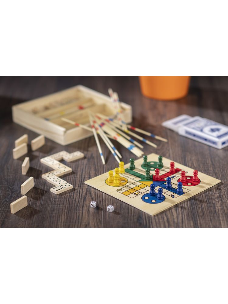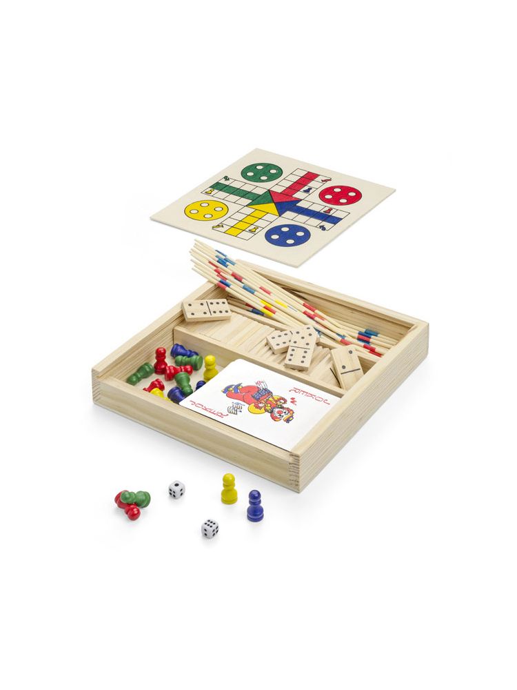 Zestaw gier w praktycznym drewnianym pudełku. Zawiera cztery różne gry: domino, bierki, grę planszową “Chińczyk” oraz talię kart. Logo wygrawerujemy na pokrywce pudełka.