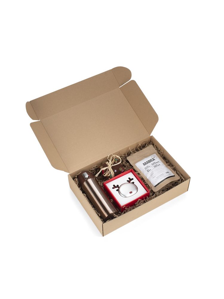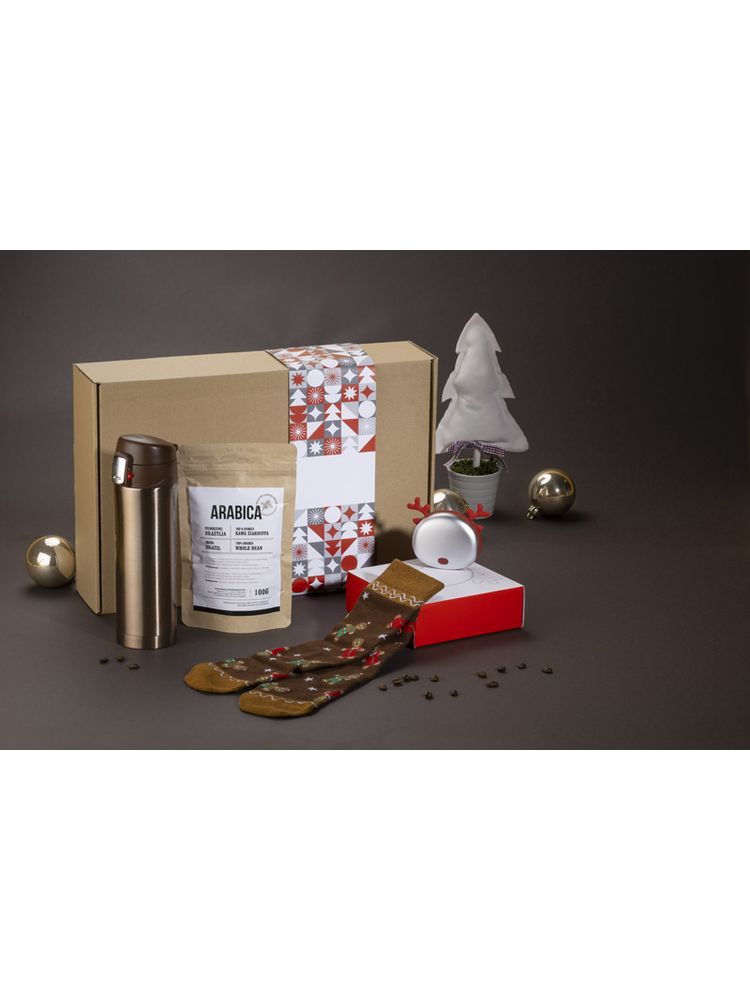 Zestaw świąteczny GRANS to propozycja gotowego prezentu świątecznego do obdarowania bliskich, partnerów biznesowych czy pracowników. Produkty w zestawie zostały tak dobrane, aby były ciekawe, praktyczne i różnorodne. W zestawie GRANS znajdują się: kawa Arabica 100 g, kubek termiczny 440 ml, power bank 4500 mAh, skarpetki z motywem świątecznym. Kawa dołączona do zestawu to kawa ziarnista 100% Arabica z Brazylii. Idealna dla osób które lubią delikatną i mało kwasową kawę. Całość zapakowana w brązowy kartonik wyłożony ozdobnym siankiem.