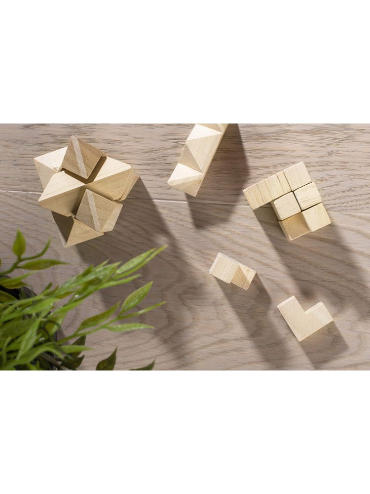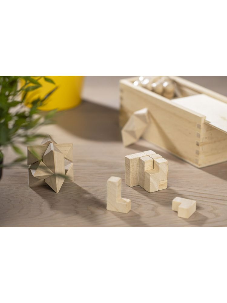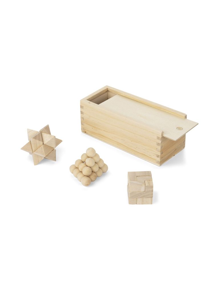 Zestaw ekologiczny trzech układanek logicznych. Zestaw pakowany w skrzyneczkę, wykonany z drewna.