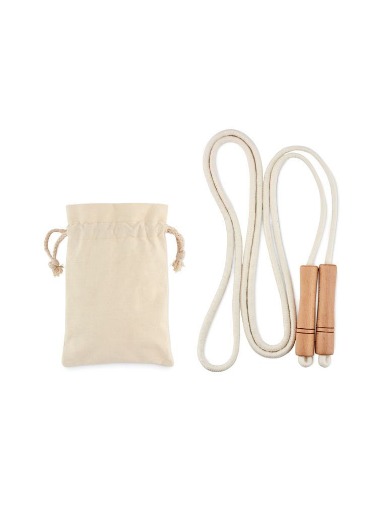 Bawełniana skakanka z drewnianymi uchwytami. Pakowana w bawełnianym etui.