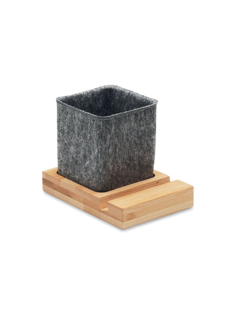 Piórnik z filcu RPET z bambusową podstawą i podstawką na telefon.
