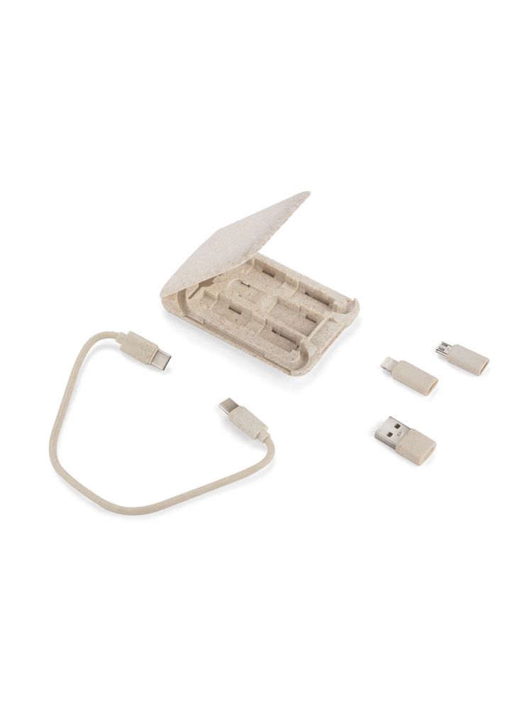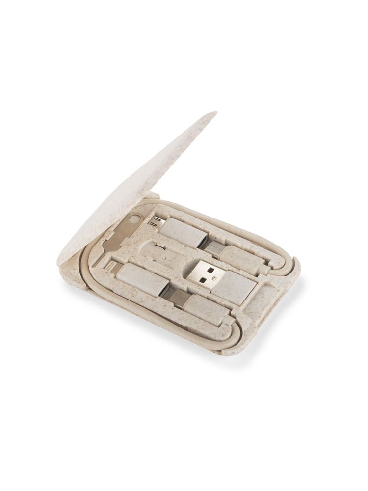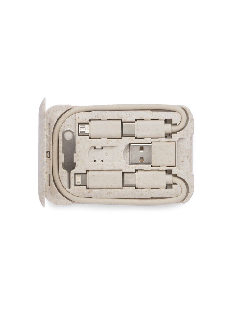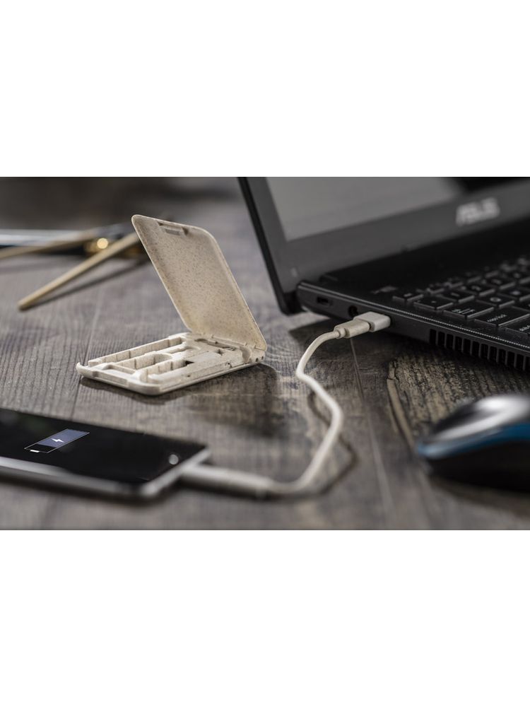OLIN to praktyczny zestaw potrzebnych do ładowania kabli, który zmieści się w każdej torebce, plecaku, czy w kieszeni. Podstawowy kabel USB C – USB C wraz z adapterami: USB C – USB, USB C – microUSB, USB C – iPhone został zapakowany w poręczne i kompaktowe etui, które pełni jednocześnie funkcję stojaka do telefonu. Dodatkowo w etui znajduje się kluczyk do karty SIM oraz miejsce na przechowywanie karty SIM. Etui zostało wykonane z tworzywa zmieszanego w 40% ze słomą pszenną, dzięki czemu do wyprodukowania go zużyto mniej nowego tworzywa sztucznego.