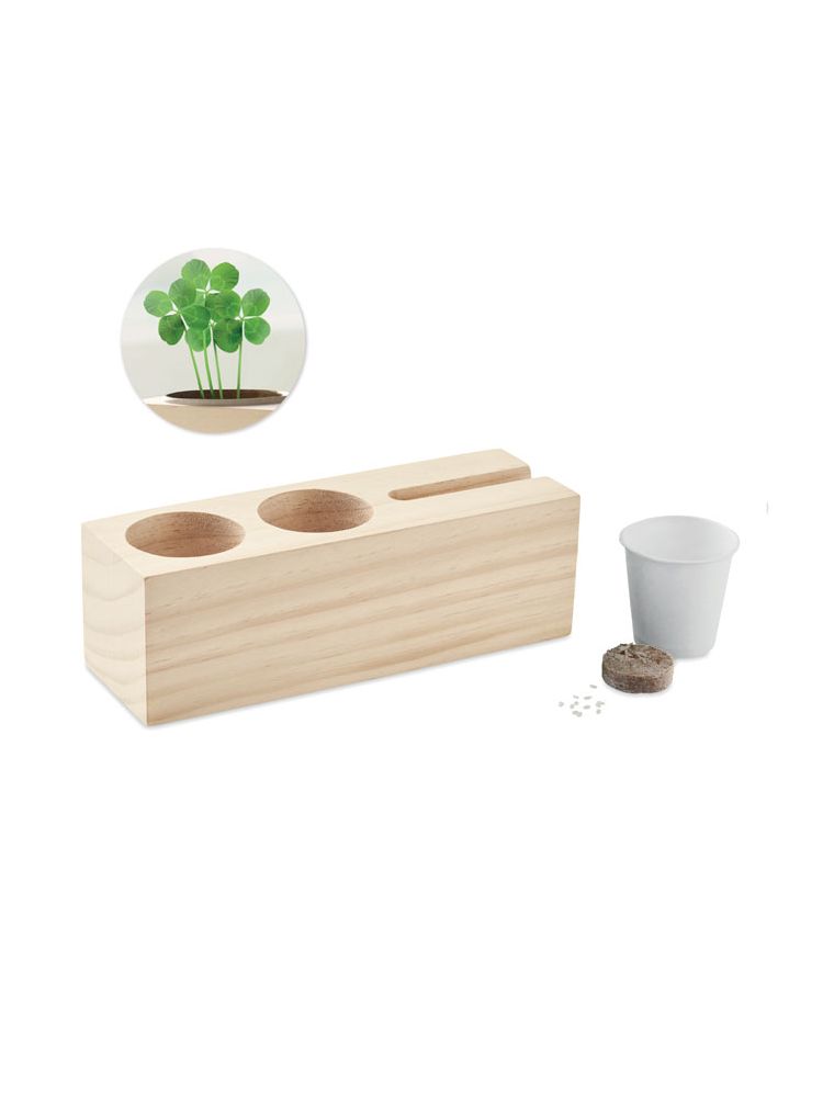 Drewniany stojak na biurko z uchwytem na długopis i telefon oraz nasionami koniczyny. Wnieś trochę życia i zieleni do swojego biura lub domu dzięki tej oryginalnej dekoracji na biurko, lub stół. Zasadź nasiona, a koniczyna sama wyrośnie. Może zaskoczy Cię kilka czterolistnych koniczynek na szczęście? Drewno jest produktem naturalnym, mogą wystąpić niewielkie różnice w kolorze i rozmiarze poszczególnych elementów, co może mieć wpływ na ostateczny efekt dekoracji. Krążek torfowy w zestawie. FSC®-certified | FSC 100%, W13.2, FSC-C213206