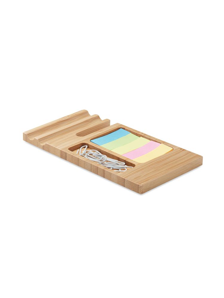 Bambusowy stojak na telefon na biurko ze spinaczami do papieru i karteczkami samoprzylepnymi. Zorganizowane biuro to wydajne biuro. Utrzymuj swoje biurko w czystości i używaj organizera do przechowywania mniejszych artykułów biurowych w jednym miejscu. Ten bambusowy stojak posiada również uchwyt na smartfona. Bambus jest produktem naturalnym, mogą wystąpić niewielkie różnice w kolorze i rozmiarze poszczególnych elementów, co może mieć wpływ na końcowy efekt dekoracji. FSC®-certified | FSC 100%, N5.7, FSC-C213206