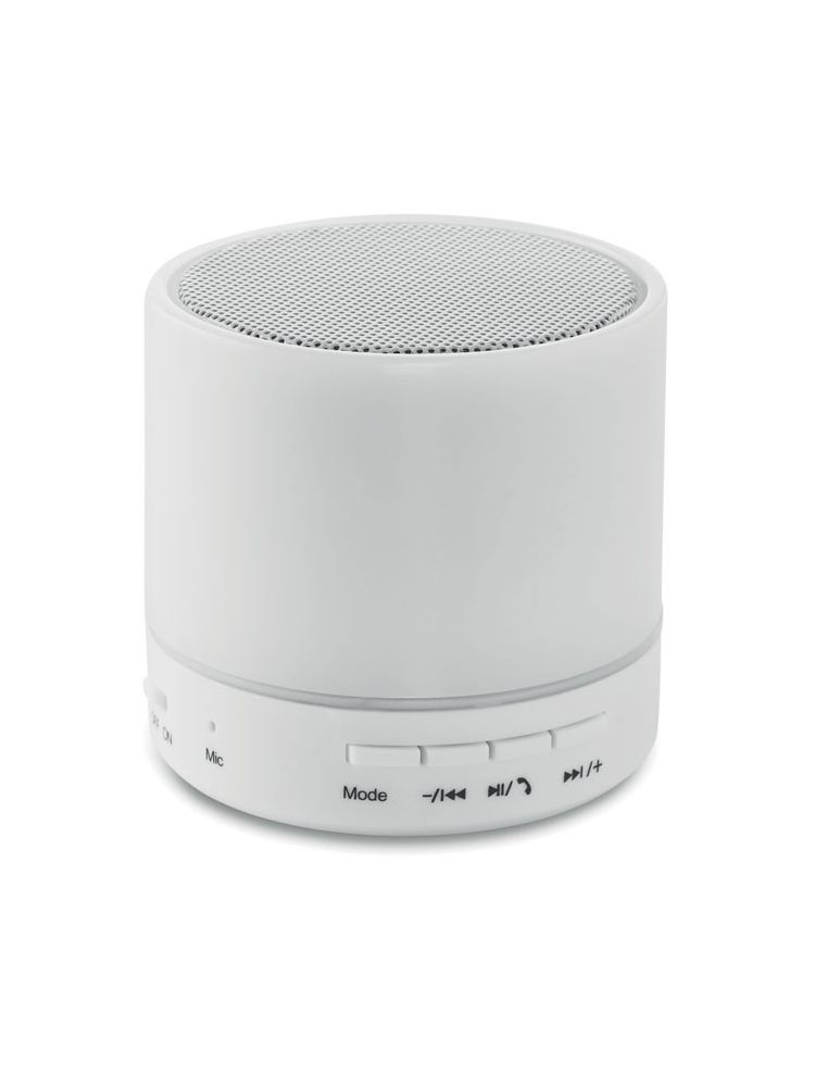 Bezprzewodowy głośnik 2.1 z ABS ze wskaźnikiem LED. 3 zmienne barwy światła. Dołączony 1 akumulator litowy 500 mAh. Zawiera port na karty SD i port do kabli AUX/ USB. Funkcja połączenia hands free. Wyjście: 3W, 4 Ohm. Czas odtwarzania ok. 2h.