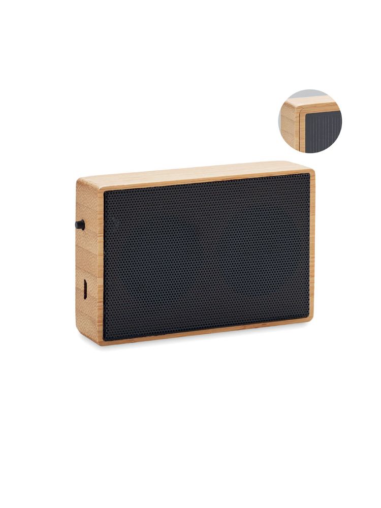 5.0 bezprzewodowy głośnik zasilany energią słoneczną o mocy 3W z bambusową obudową. 1 akumulator Li-Ion 500 mAh. Czas odtwarzania około 4 godziny. Bambus jest produktem naturalnym, dlatego mogą wystąpić nieznaczne różnice w kolorze, wzorze i rozmiarze.