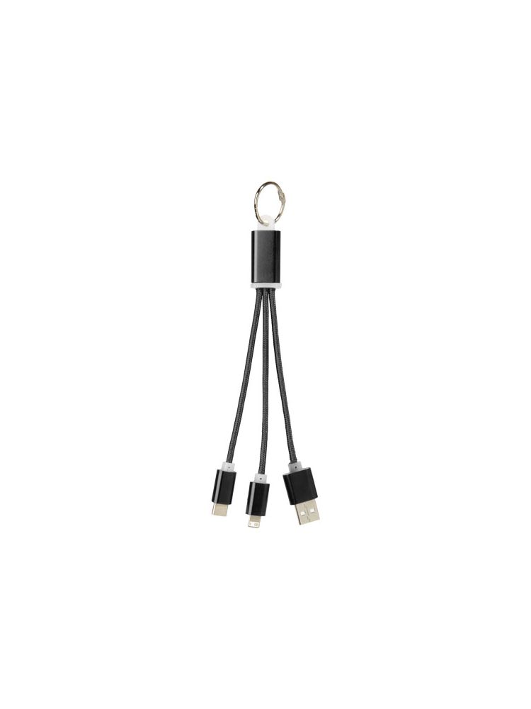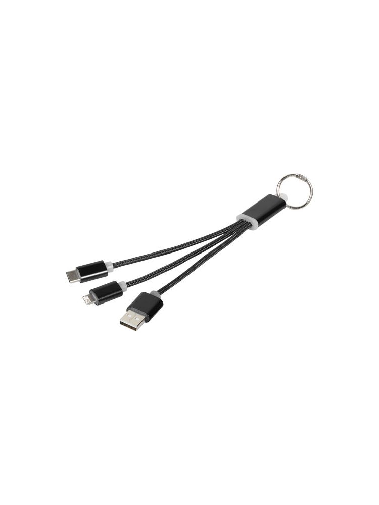 Metalowy kabel do ładowania 3 w 1 z kółkiem na klucze. Metalowy kabel do ładowania 3 w 1 z kółkiem na klucze wyposażony jest w jedną końcówkę typu C, jedną końcówkę USB A oraz podwójną końcówkę 2 w 1 zgodną z urządzeniami z Apple iOS i Android. W zestawie brelok. Aby naładować urządzenia Apple: umieścić kabel stroną bez bolców w urządzeniu, aby naładować urządzenia z systemem Android: umieścić kabel stroną z bolcami w urządzeniu.