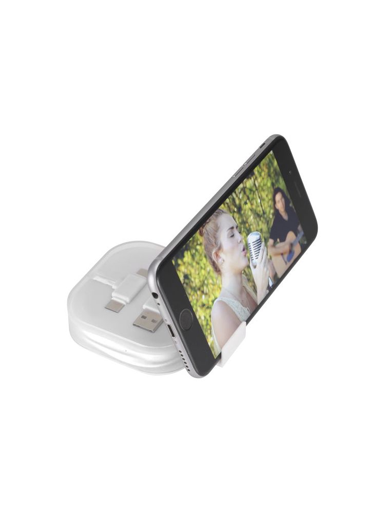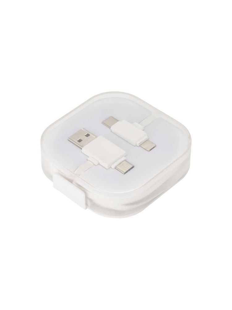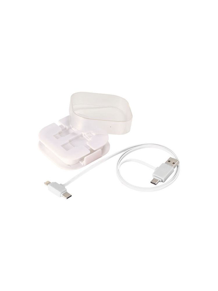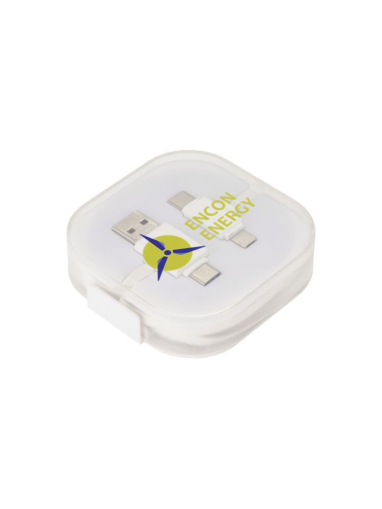 Kabel do ładowania 4w1 ma 2 końcówki USB C, 1 USB A oraz końcówkę 2w1 kompatybilną z urządzeniami Apple® iOS oraz Android. Obsługuje ładowanie i wymianę danych. Aby ładować urządzenia Apple należy włożyć w nie końcówkę gładką, zaś aby ładować urządzenia Android należy użyć końcówkę z wtykami.