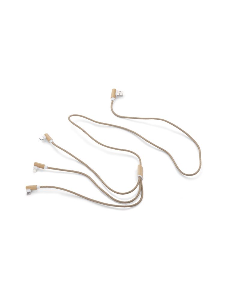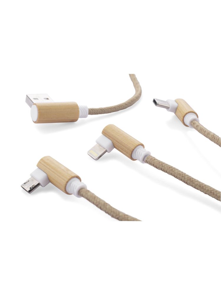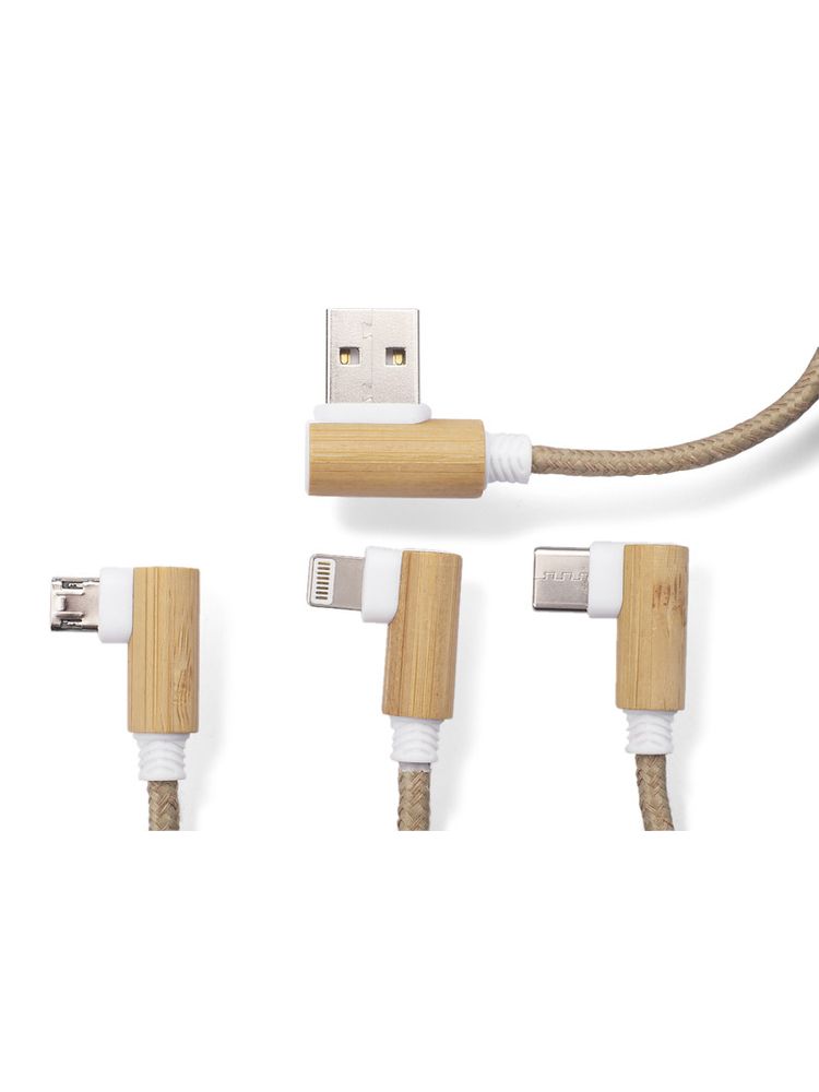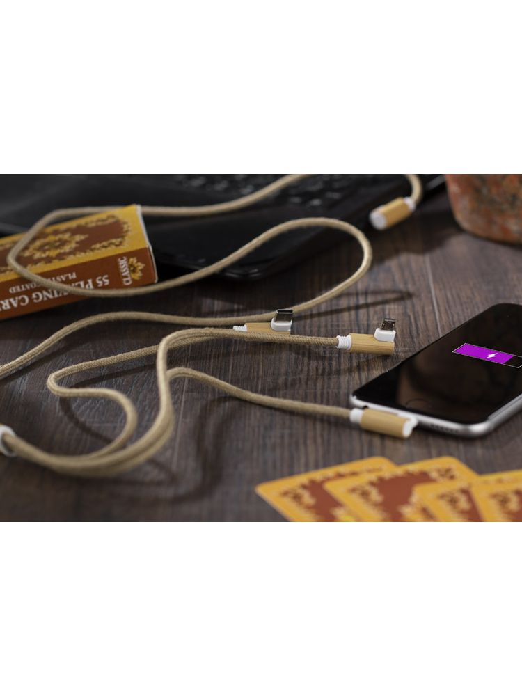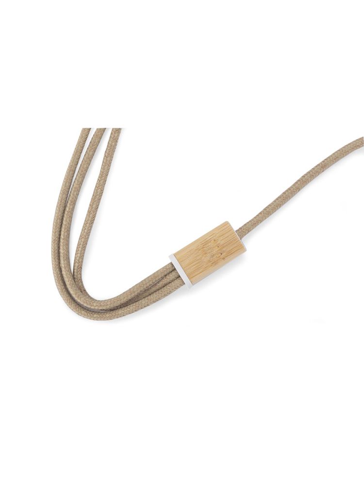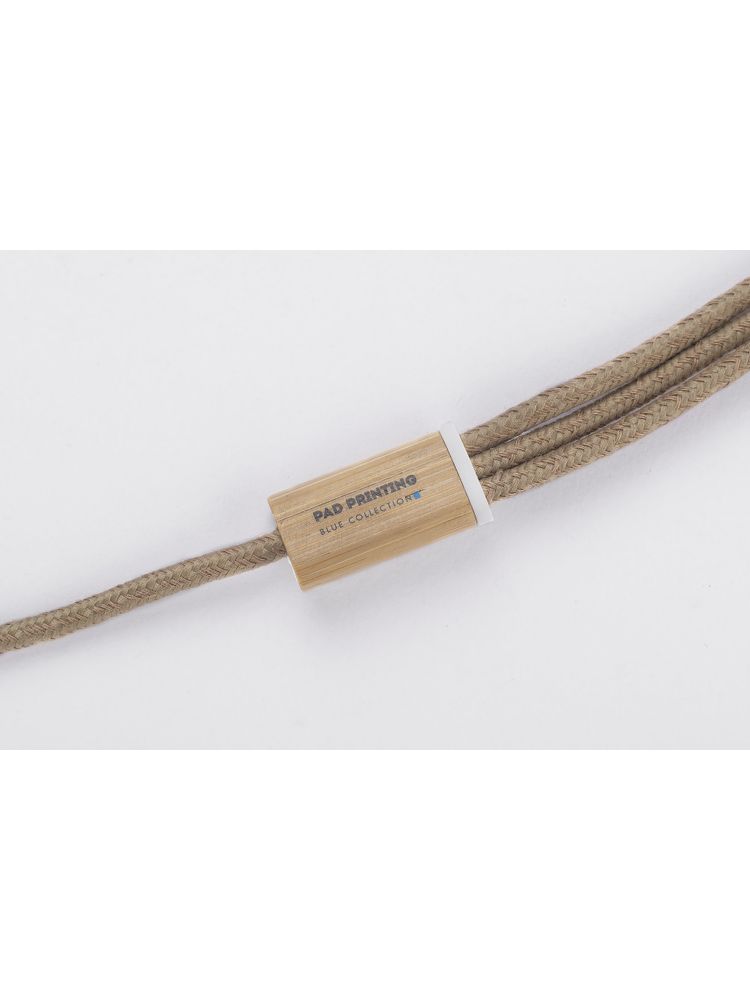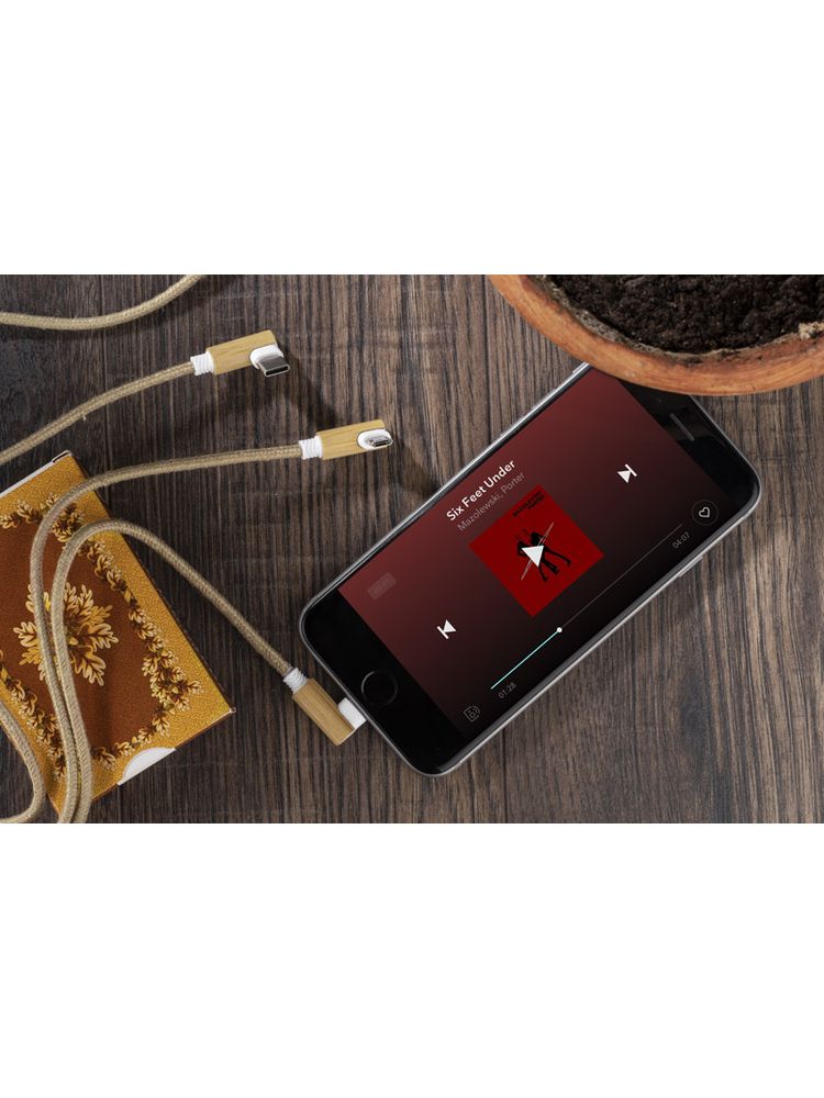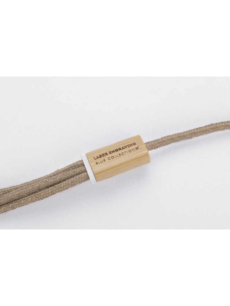 Kabel USB FLAX to praktyczny gadżet codziennego użytku w ekologicznym wykonaniu. Przewód kabla został pokryty lnem, a wtyczki wykończone są naturalnym bambusem. Kabel posiada 3 typy końcówek do podłączenia urządzeń mobilnych: micro USB, USB C oraz Lightning (iPhone). Wszystkie wtyczki, także wyjściowa USB, są dwustronne (nie ma znaczenia w którą stronę zostanie włożona do gniazda), co znacznie ułatwia korzystanie. Kabel ma długość około 110 cm. Kabel służy tylko do ładowania.