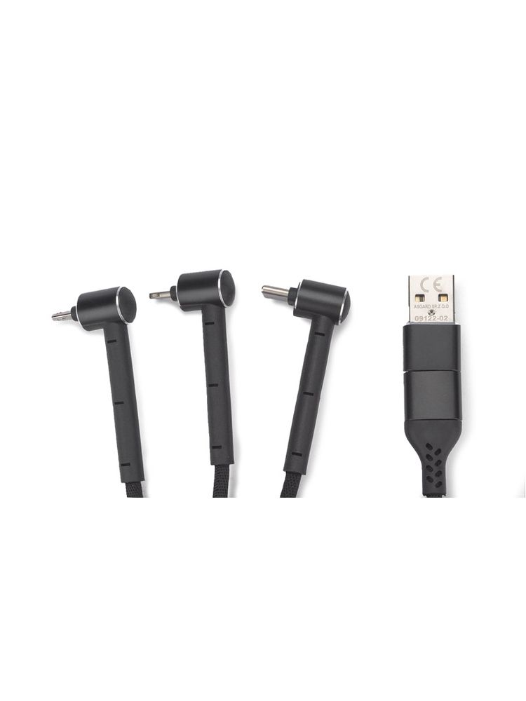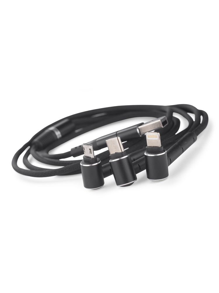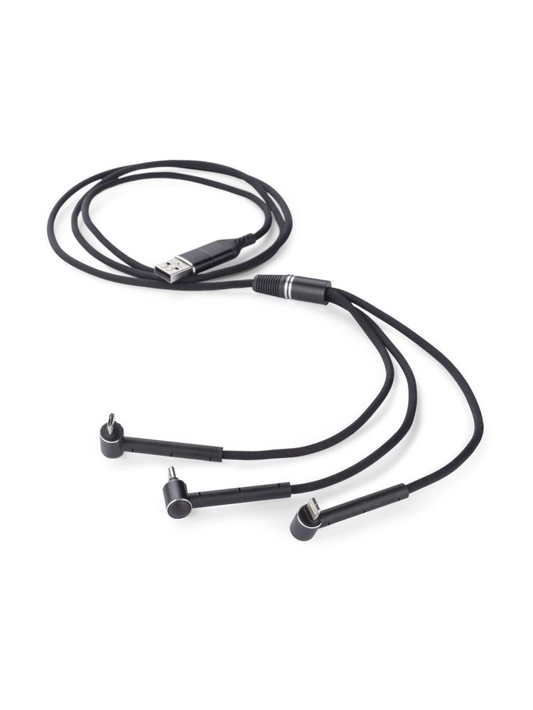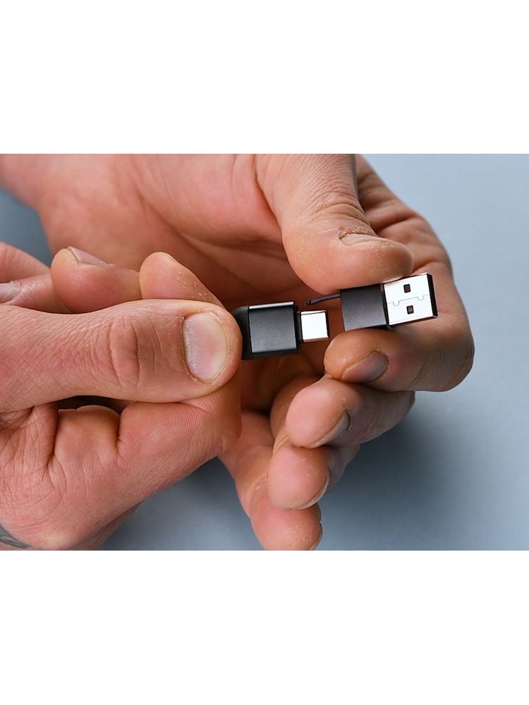Kabel USB do ładowania RICO to aż sześć funkcji w jednym produkcie. Posiada dwa wejścia: USB-A i USB-C i trzy wyjścia: micro USB, USB-C i Lightning (iPhone). Dodatkowo, trzy końcówki posiadają specjalne wzmocnienia z tworzywa, które umożliwiają zastosowanie kabla jako stojaka na telefon! Sam przewód powleczony jest wytrzymałym materiałem i ma długość ok. 1,20 m. Tylko do ładowania.