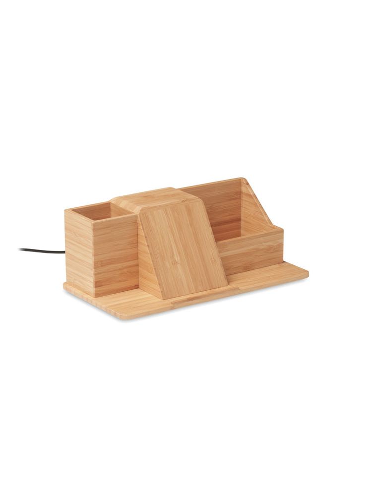 Bambusowy organizator na biurko i uchwyt na długopisy z 10W bezprzewodową ładowarką do telefonu. Wyjście: DC 9V/1.1A (15W) do szybkiego ładowania. Bambus jest produktem naturalnym, dlatego mogą wystąpić nieznaczne różnice w kolorze, wzorze i roz