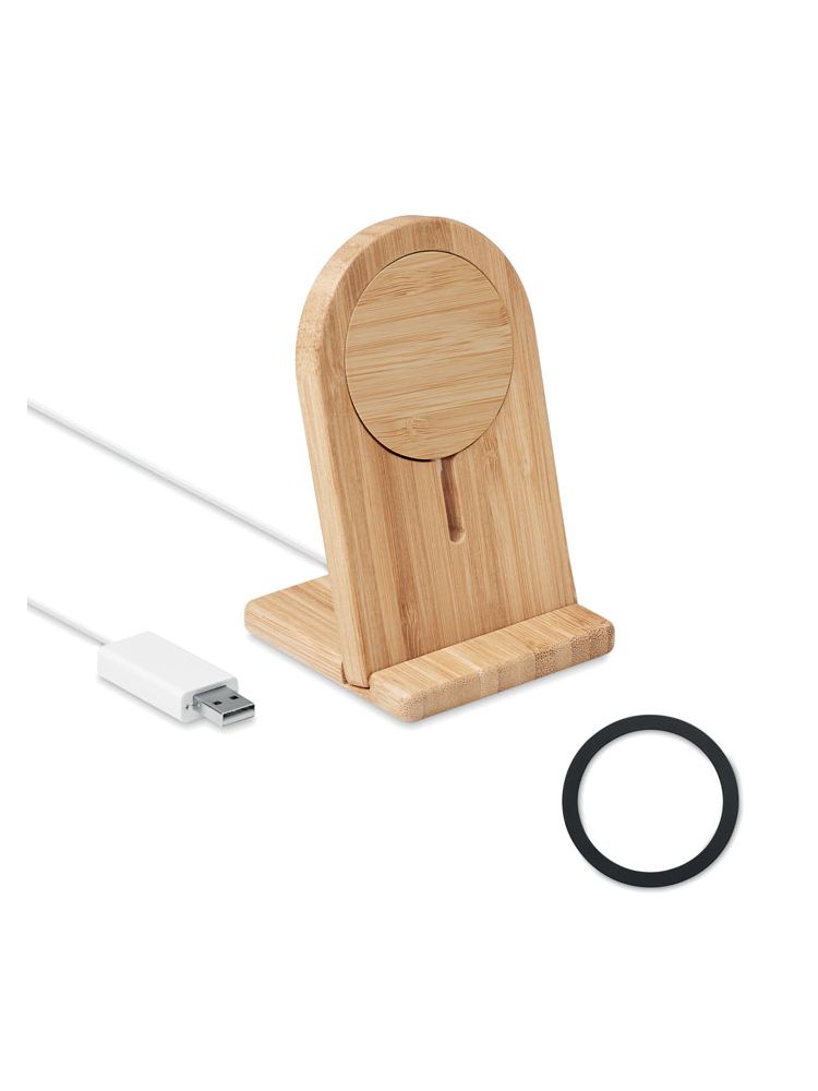 Magnetyczna bambusowa ładowarka bezprzewodowa z podstawką. Wyjście: DC 9V/1.1A (10W). Kompatybilna z iPhone® 12 i nowszymi. Zawiera dodatkowy magnetyczny metalowy pierścień do obsługi ładowania innych niemagnetycznych telefonów bezprzewodowego ładowania. Bambus jest produktem naturalnym, dlatego mogą wystąpić nieznaczne różnice w kolorze, wzorze i rozmiarze.