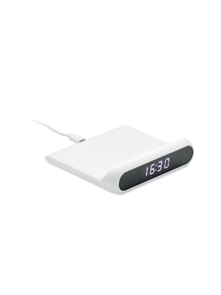 Ładowarka bezprzewodowa 10W z budzikiem z białymi diodami LED, w obudowie z tworzywa ABS. Zawiera kabel USB do ładowania typu C. Wyjście: DC 9V/1,10A (10W) do szybkiego ładowania. Kompatybilna z najnowszymi telefonami Android, iPhone® 8, X i nowszymi.