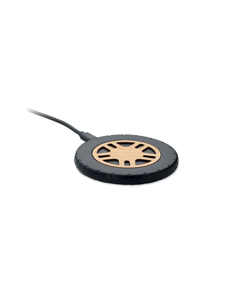Bezprzewodowa ładowarka 15 W z ABS z recyklingu i bambusową nakładką. Kształt koła samochodowego. Podłącz urządzenie do komputera, umieść na nim smartfon i pozwól mu się naładować. Wyjście: DC 9V/1.10A (15W) do szybkiego ładowania.