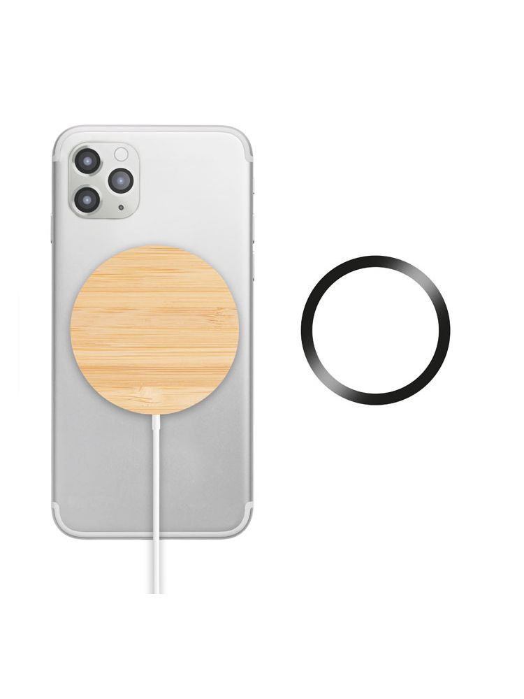 Magnetyczna bambusowa ładowarka bezprzewodowa. Wyjście: DC 9V/1.1A (10W) do szybkiego ładowania. W tym dodatkowy magnetyczny metalowy pierścień do ładowania innych niemagnetycznych telefonów z funkcją bezprzewodowego ładowania. Bambus jest produkt