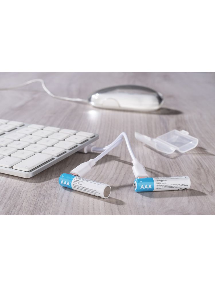 Zestaw akumulatorków AAA 450 mAh to produkt stworzony specjalnie z myślą o użytkownikach urządzeń elektronicznych. Akumulatory zasilane są przez port USB typu C, co oznacza, że nie jest wymagana dedykowana ładowarka. W zestawie znajduje się podwójny kabel USB-C, który umożliwia zasilanie dwóch akumulatorów w tym samym czasie. Dzięki wskaźnikowi LED na baterii wiesz, jaki jest aktualny status naładowania. Zestaw akumulatorków AAA 450 mAh to rozwiązanie przyjazne dla środowiska – akumulatory doładujesz do 1200 razy, unikając zużycia 1200 zwykłych baterii. Pełne naładowanie: 1 godz.