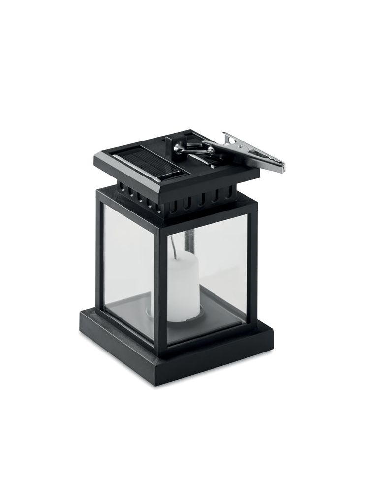 Solarna latarnia zewnętrzna z żarówką LED w kształcie świeczki. Obręcz i klips na górze. Około 5 godzin pracy. Dołączona bateria 300 mAh NI-MH. IP44.