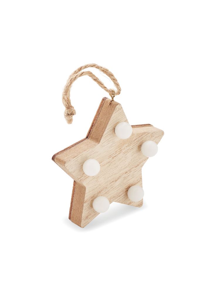 Drewniana (80% topoli i 20% weed wood) ozdobna gwiazdka z 6 lampkami LED i sznurkiem do zawieszenia. Zawiera 1 baterię CR2032. Drewno jest produktem naturalnym, dlatego mogą występować niewielkie różnice w kolorze i rozmiarze poszczególnych elementów, co może mieć wpływ na ostateczny efekt zdobienia.