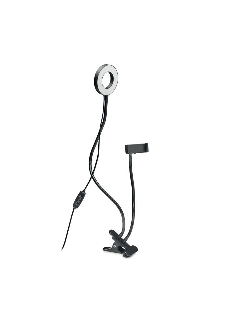 Przenośna lampa pierścieniowa LED 24 cm do selfie z uchwytem na telefon i klipsem. Idealna do tik-tok®, live-streamingu, transmisji i fotografii. Białe, ciepłe, światło z 3 poziomami jasności.