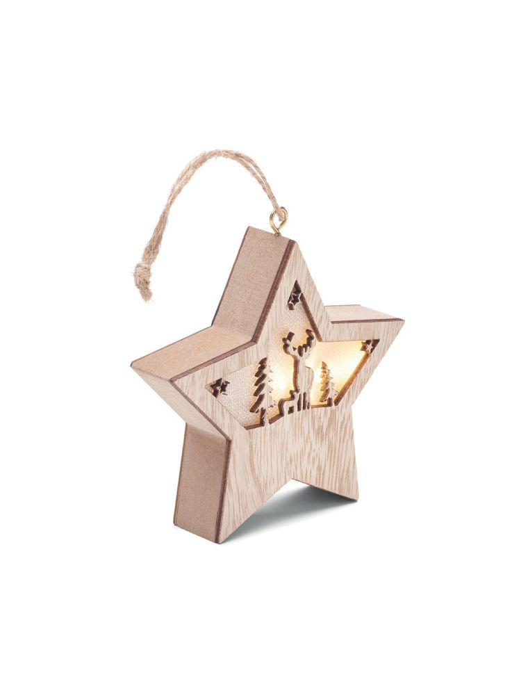 Gwiazda z płyty MDF z lampką w środku, z ozdobami świątecznymi i sznurkiem do zawieszania. Zawiera 3 baterie LR44.