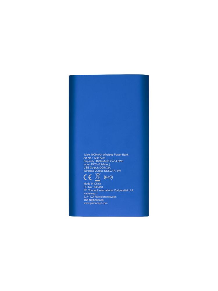 Powerbank o pojemności 4000 mAh z aluminiową obudową. Obsługuje bezprzewodowe ładowanie o mocy 5 W, a także ma wyjście micro USB umożliwiające ładowanie za pomocą kabla. Dzięki litowo-polimerowej baterii o pojemności 4000 mAh może w pełni naładować smartfona. Wskaźnik zasilania, który pokazuje poziom energii przez cały czas. Wbudowany port micro USB: Wyjście 5 V / 2 A: 5V/2A. Bezprzewodowa moc wyjściowa: W zestawie wolny od PVC kabel ładujący z tworzywa TPE. Dostarczane w ozdobnym pudełku upominkowym.