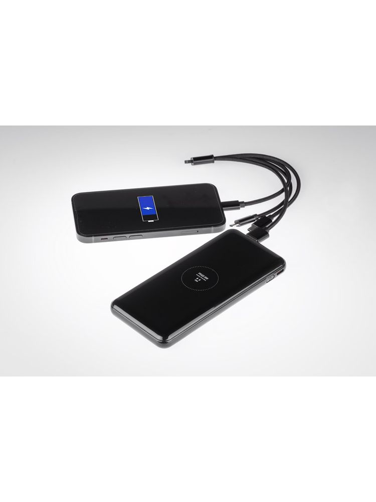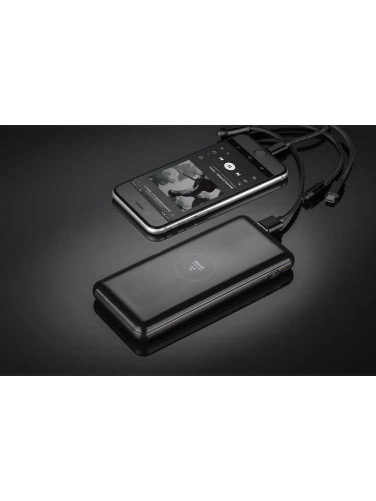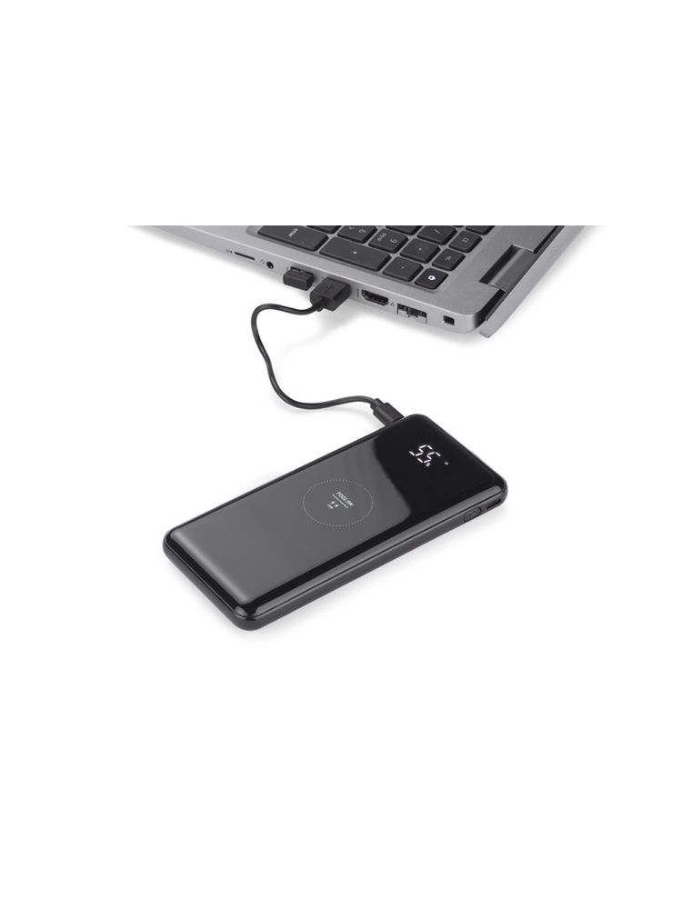 FUERTE 15W to power bank, który posiada wiele nowoczesnych funkcji. Najważniejszą z nich jest funkcja szybkiego ładowania Power Delivery (PD). Jest to standard szybkiego ładowania umożliwiający przesyłanie dużych mocy przez złącze typu USB-C. Technologia charakteryzuje się zwiększonym poziomem mocy, w przypadku FUERTE jest to aż 15W. Największą zaletą standardu Power Delivery jest możliwość inteligentnego dostosowywania mocy ładowania do ładowanego urządzenia. Poza tym power bank posiada wbudowaną ładowarkę bezprzewodową o maksymalnej mocy 15W, cyfrowy wyświetlacz ukryty pod elegancką lustrzaną obudową i latarkę. Port USB-C jest dwukierunkowy – jest jednocześnie wejściem i wyjściem, co oznacza, że – łącznie z dwoma wyjściami USB-A – istnieje możliwość ładowania aż trzech urządzeń jednocześnie. Kabel do ładowania jest dołączony.