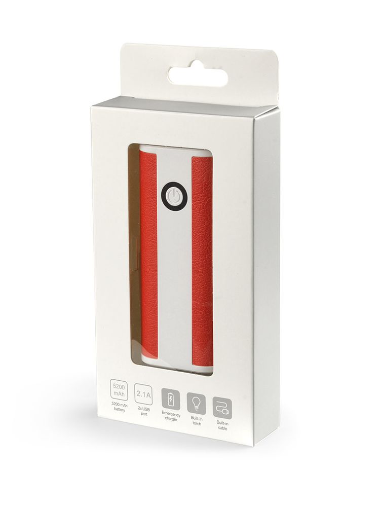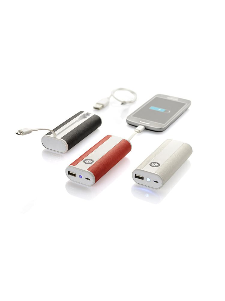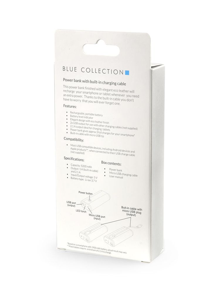 REMOTE to power bank o pojemności 5200 mAh. Boki urządzenia pokryte są ekoskórą. Power bank ma wbudowany kabel z wejściem micro USB, latarkę z dwoma trybami świecenia (ciągłym i migającym) oraz 4 diody informujące o poziomie baterii. Wejście 5 V / 1 A, wyjście 5V / 1 A (zintegrowany kabel) i 2.1 A (port USB). W zestawie dołączony kabel z wtyczką micro USB.