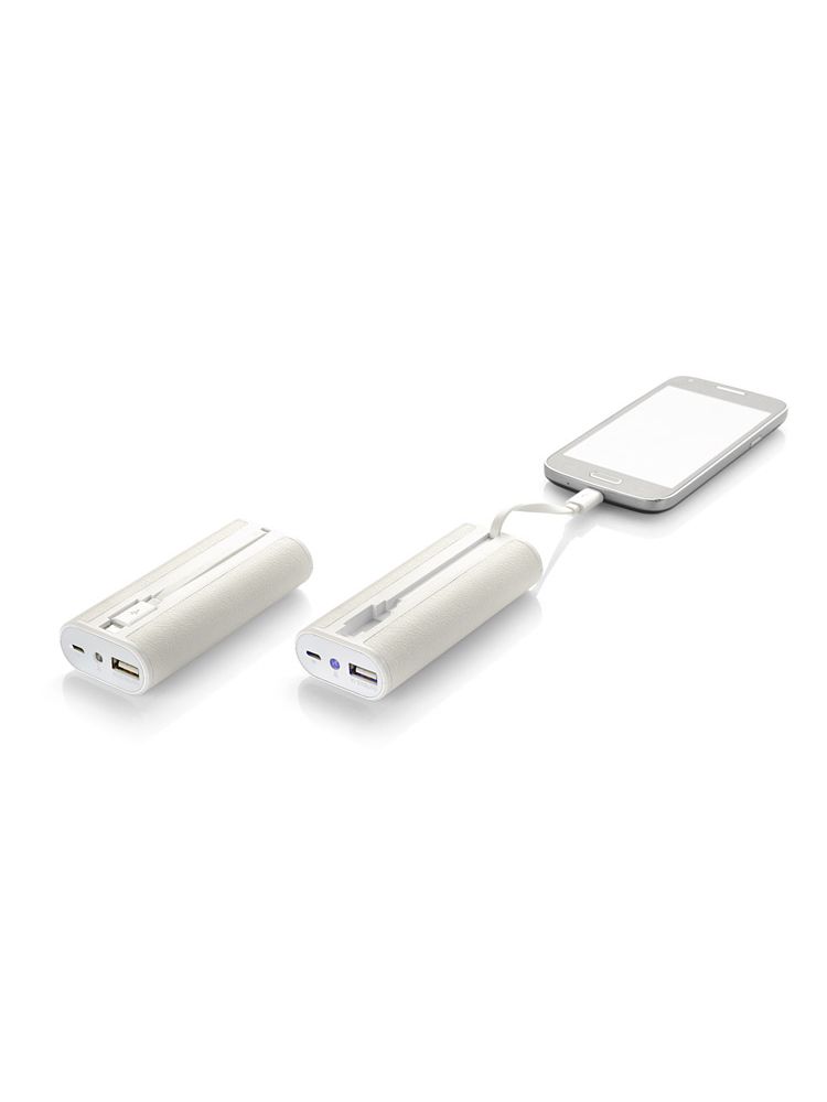 REMOTE to power bank o pojemności 5200 mAh. Boki urządzenia pokryte są ekoskórą. Power bank ma wbudowany kabel z wejściem micro USB, latarkę z dwoma trybami świecenia (ciągłym i migającym) oraz 4 diody informujące o poziomie baterii. Wejście 5 V / 1 A, wyjście 5V / 1 A (zintegrowany kabel) i 2.1 A (port USB). W zestawie dołączony kabel z wtyczką micro USB.