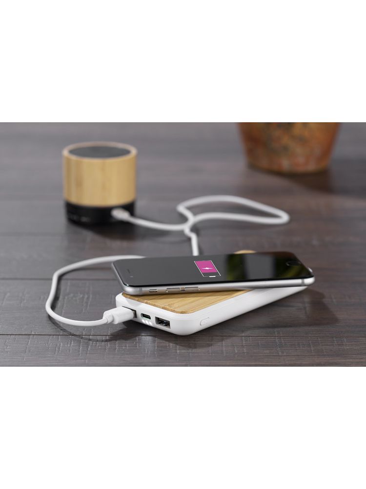 Power bank RONI to połączenie subtelnej bieli z mocnym, bambusowym akcentem, tworząc nie tylko praktyczne urządzenie, ale przede wszystkim stylowy gadżet reklamowy. Wysoka pojemność 10 000 mAh, zapewni wielokrotne naładowanie urządzeń, dostosowując się do Twoich potrzeb. Opcja ładowania bezprzewodowego oraz kablowego daje wybór, jaki preferujesz. Dane techniczne, takie jak wydajne wyjścia 2 x USB A 5V/2.1A, wejście USB C 5V/2A i bateria litowo-polimerowa, gwarantują efektywne i bezpieczne ładowanie. RONI to synonim mocy w pięknej formie. Urządzenie, na które możesz liczyć w każdej sytuacji. Do power banka nie jest dołączony kabel.